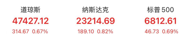 好意思东技能周三,好意思股三大指数集体收涨。抑制收盘,谈琼斯指数涨0.67%,报47427.12点;标普500指数涨0.69%,报6812.61点;纳斯达克笼统指数涨0.82%,报23214.69点。