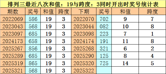 体彩陈设三最近八次同期出现和值:19与跨度:3的奖号辞别为:586、568、685、658、856、685、865、568,前七次下期开出奖号辞别为:702、082、223、191、321、125、725,详见下表: