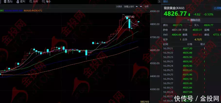 隔夜,现货黄金收盘高潮1.4%,报4830.56好意思元,金价盘中曾涉及4888.59好意思元,刷新记载高位,而在特朗普表态后,金价一度暴跌至4755.55好意思元。当天亚市早盘,黄金短暂遭逢一波抛售,现在在4830好意思元近邻踟蹰。