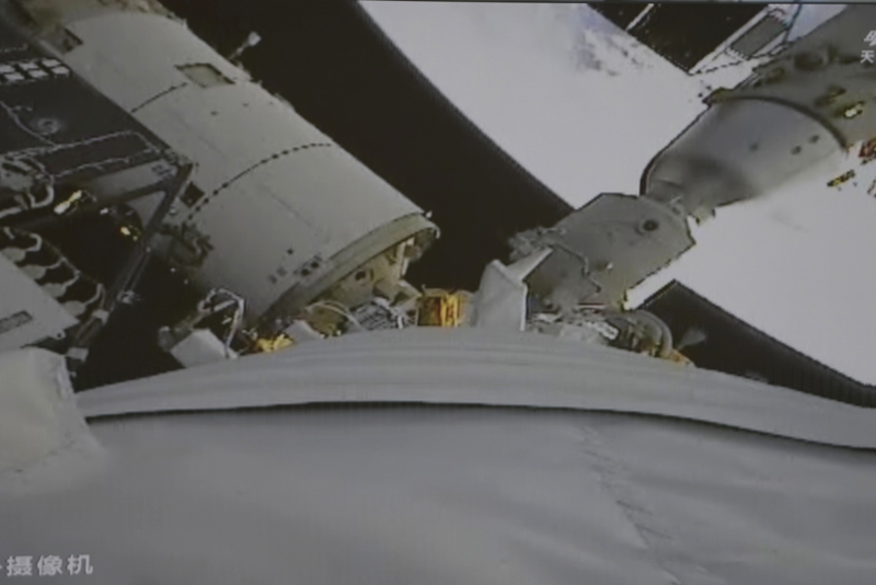 这是11月25日在北京航天涟漪收场中心拍摄的神舟二十二号飞船与空间站组合体对接成功的及时画面。神舟二十二号飞船入轨后成功完成气象诞生,于11月25日15时50分成功对接于空间站天和中枢舱前向端口。新华社记者 王春涛 摄